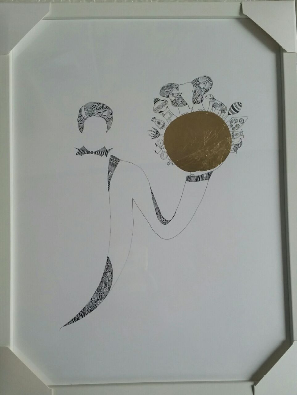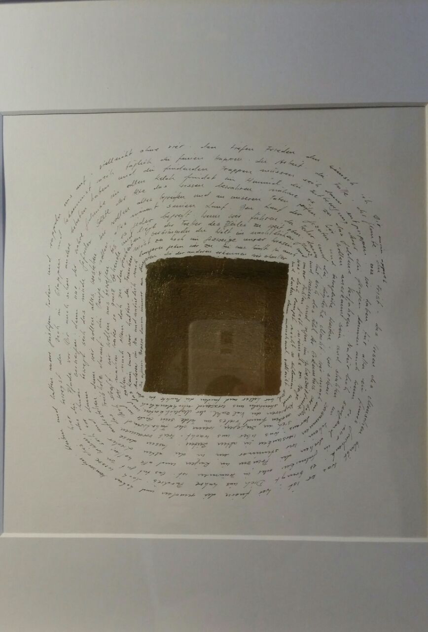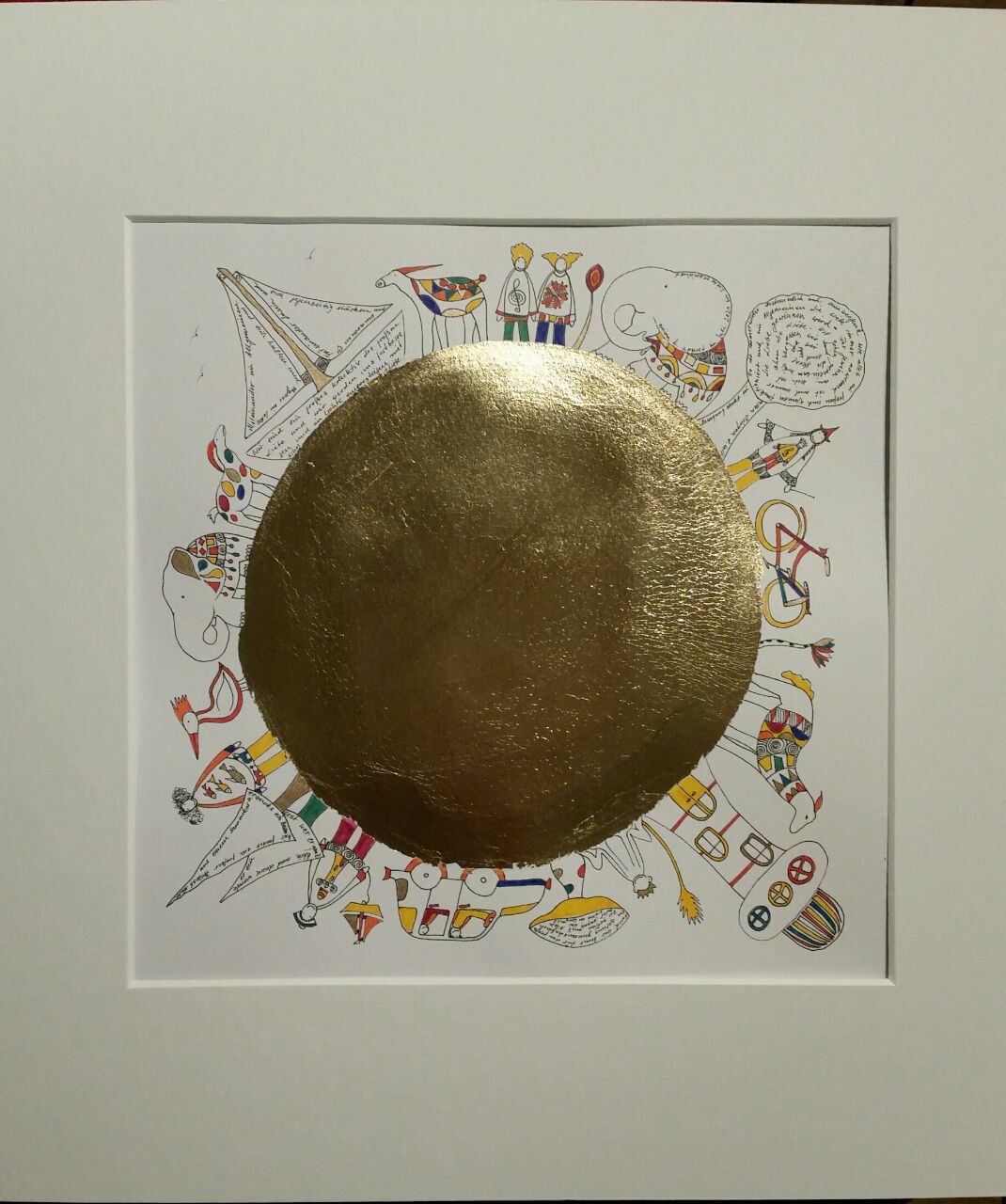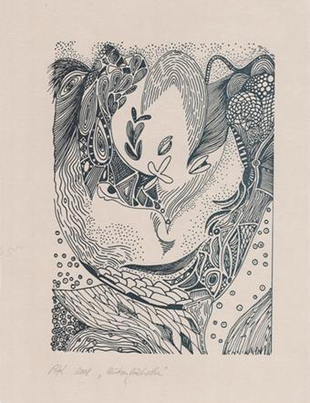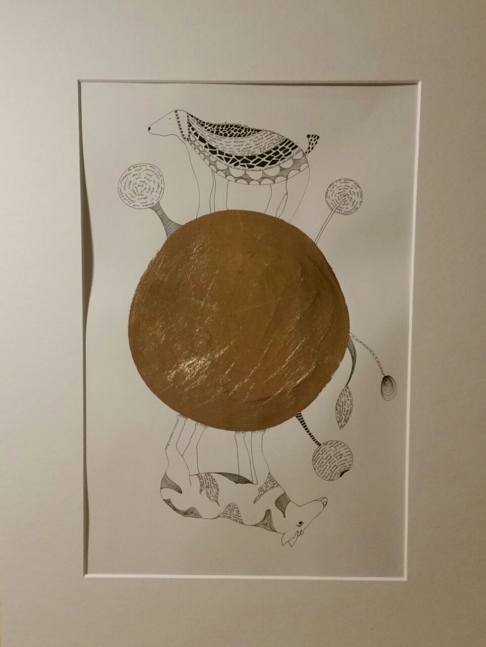 Finelinerarbeiten mit Blattmetall versehen. Die Fineliner haben eine Minenspitze von 0,03 - 0,05 mm. Filigrane Details treffen auf bewegte Gold - und Bronzeornamente.