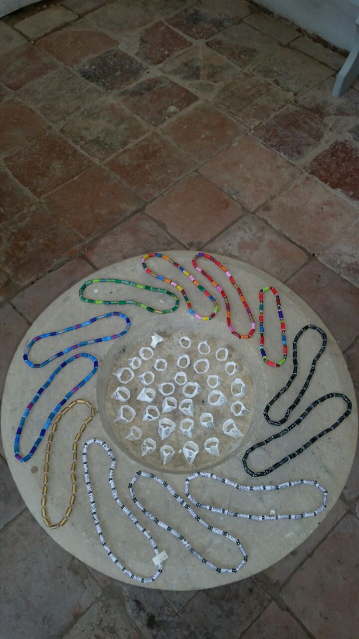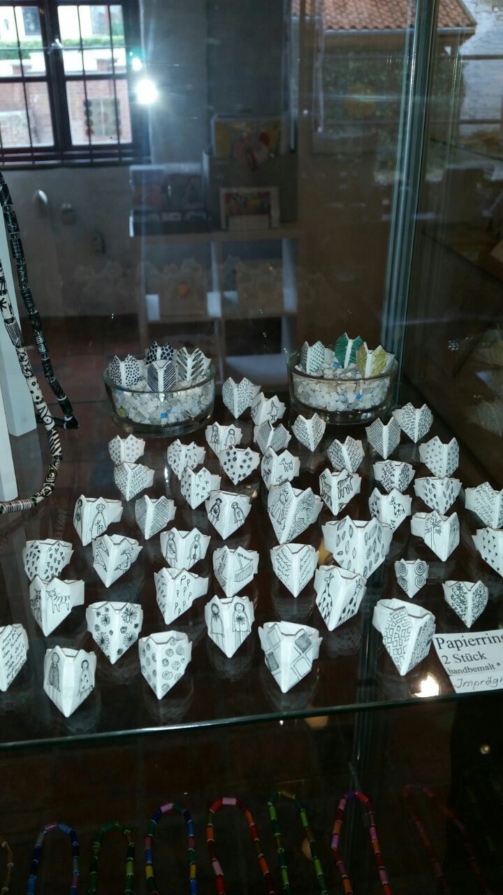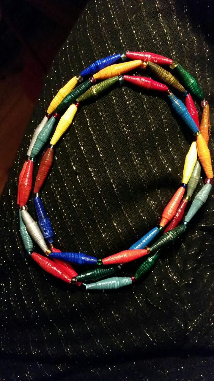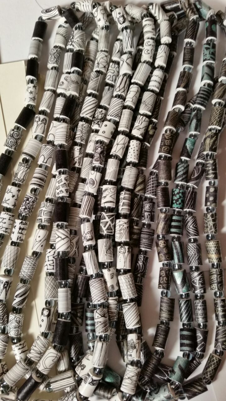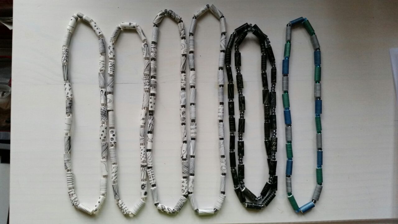 Papierperlenketten sind leicht und sehen elegant aus. Mit Texten, Farben, Zeichnungen oder Zahlen ist jede Perle ein Unikat. Papierringe kann man sogar im Brief verschicken. Sie sind reiß und wasserfest und mit feinen Grafiken versehen.